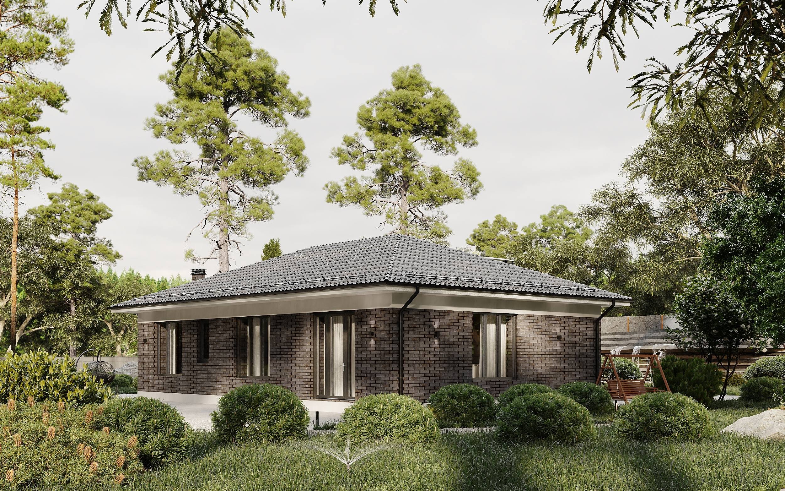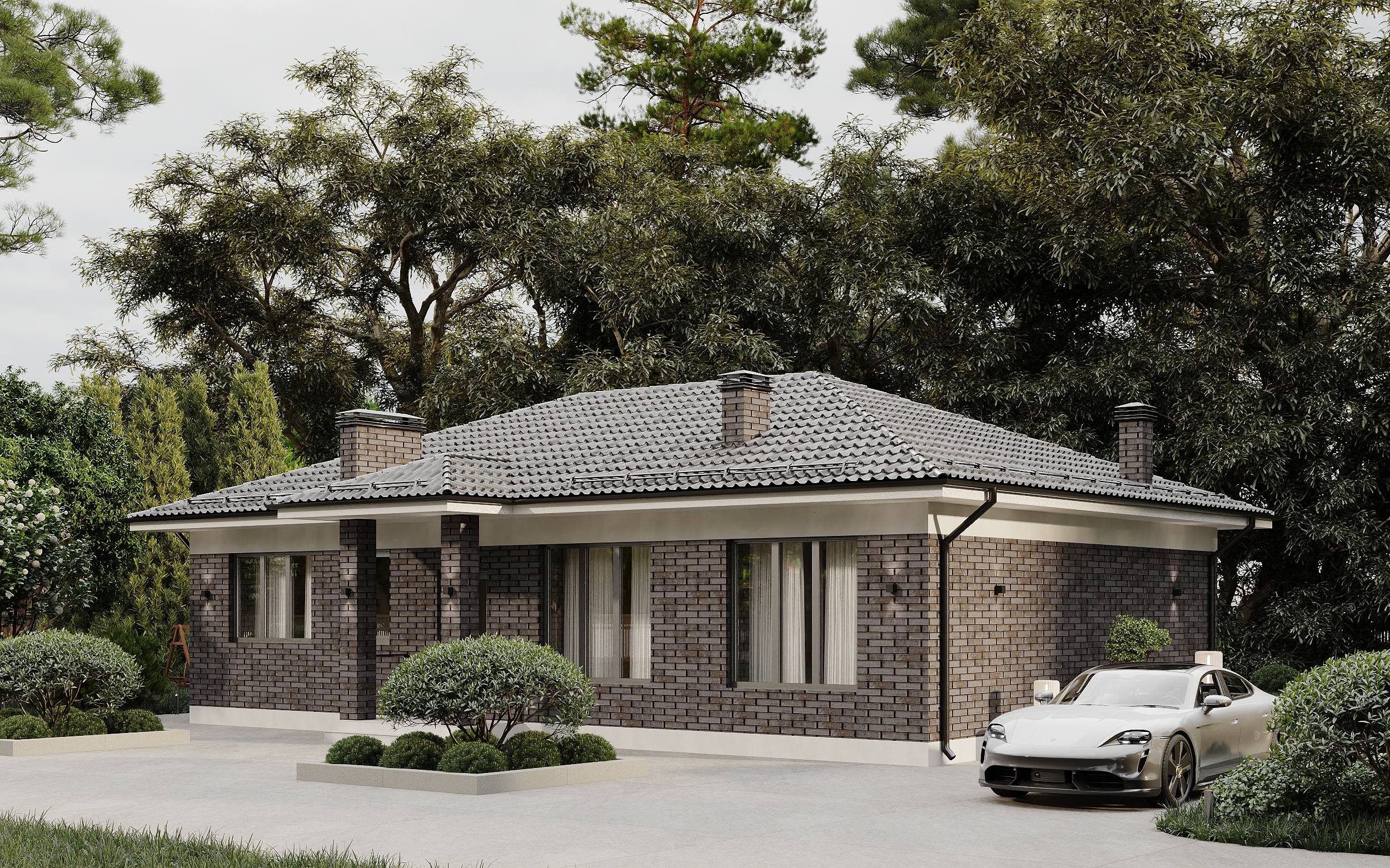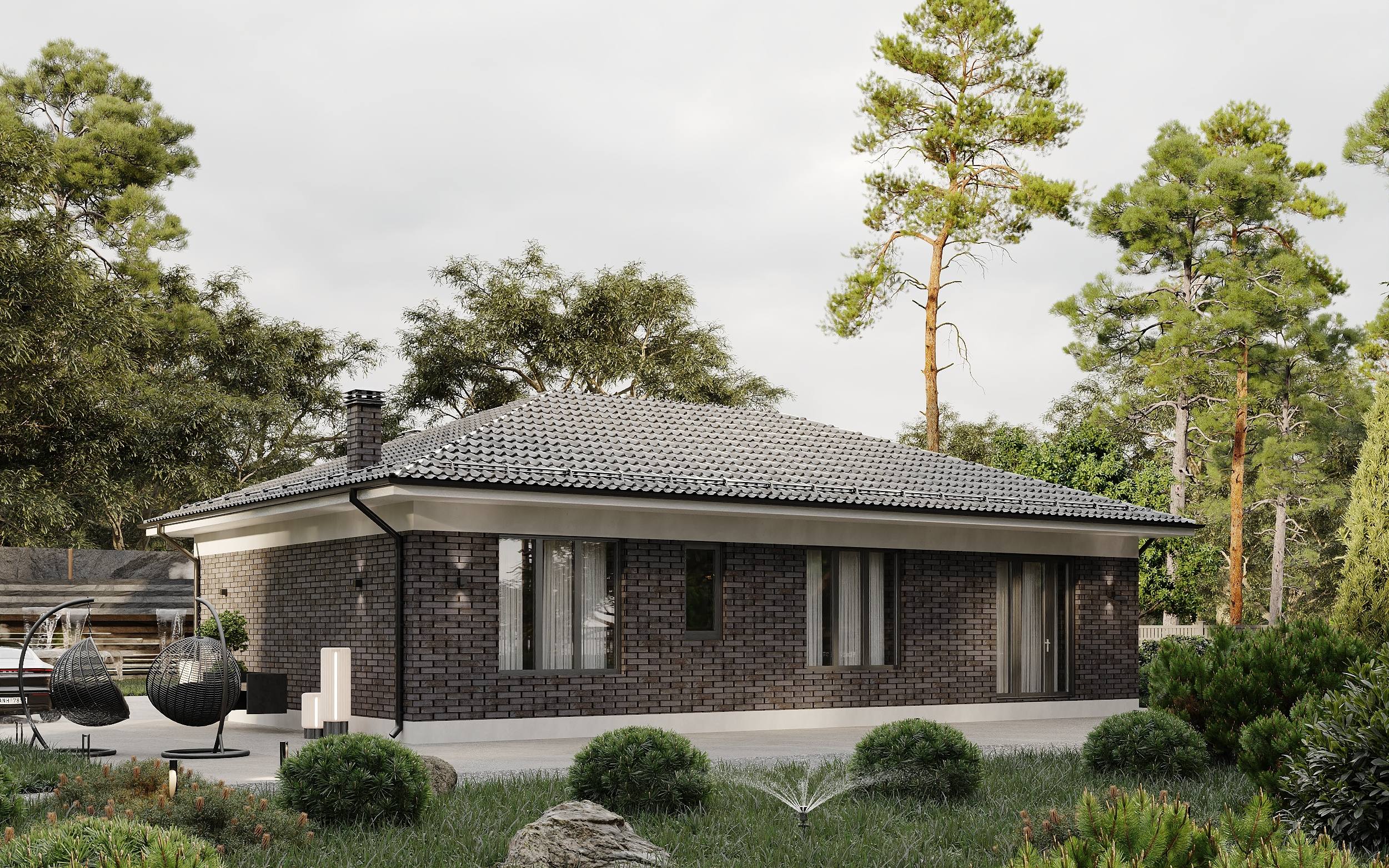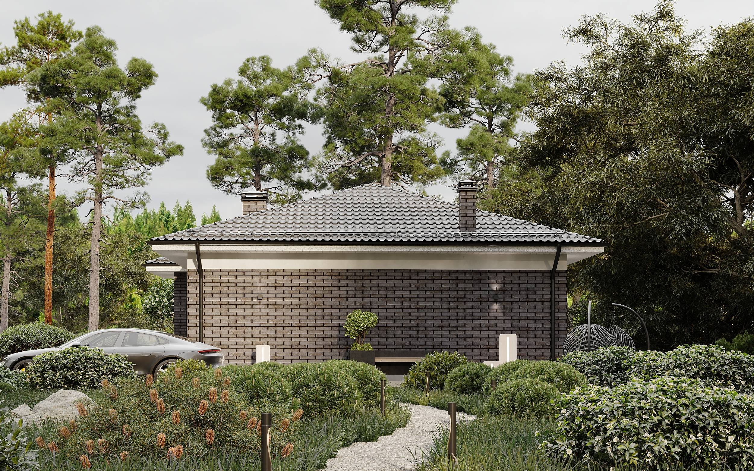 Комплекс строений связанный единой кровлей, такой прием делает коммуникацию между строений гораздо комфортнее. Благодаря перепаду на участке, технические помещения с гаражом удалось опустить ниже основного уровня дома, что безусловно сделало архитектуру еще более интересной.
