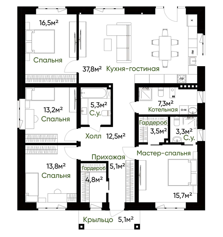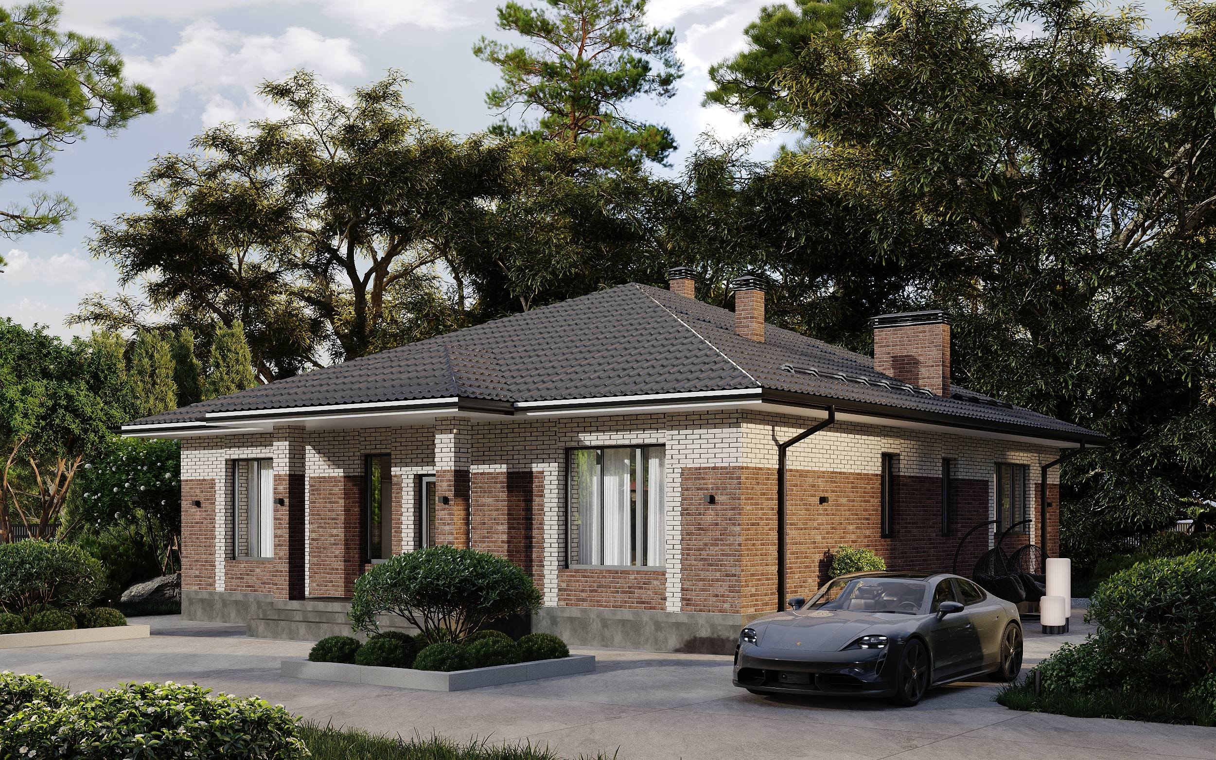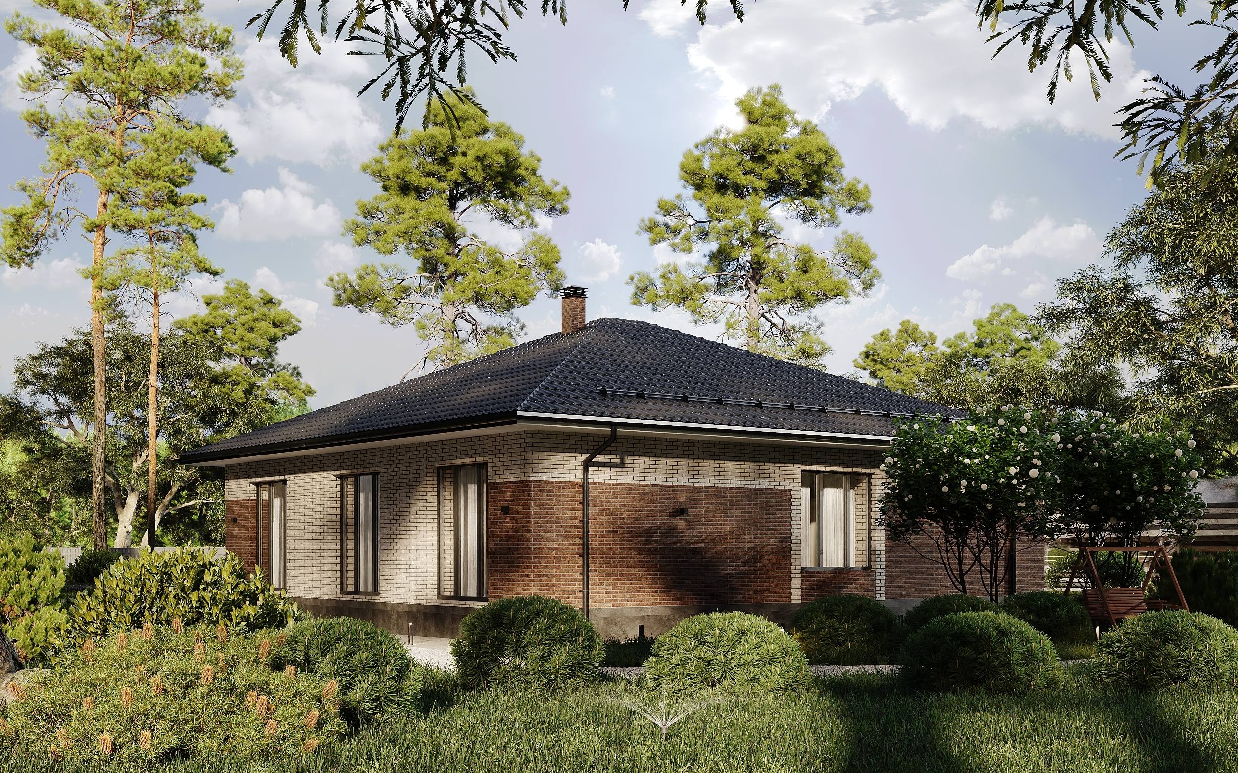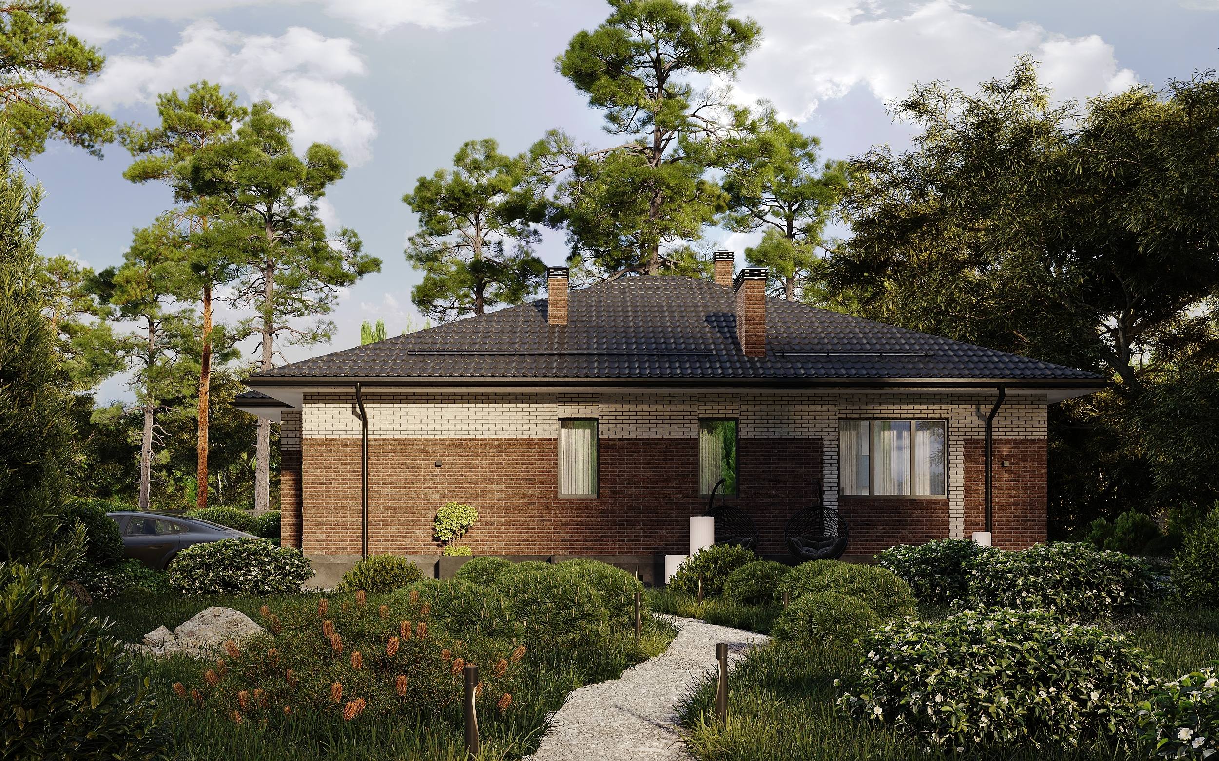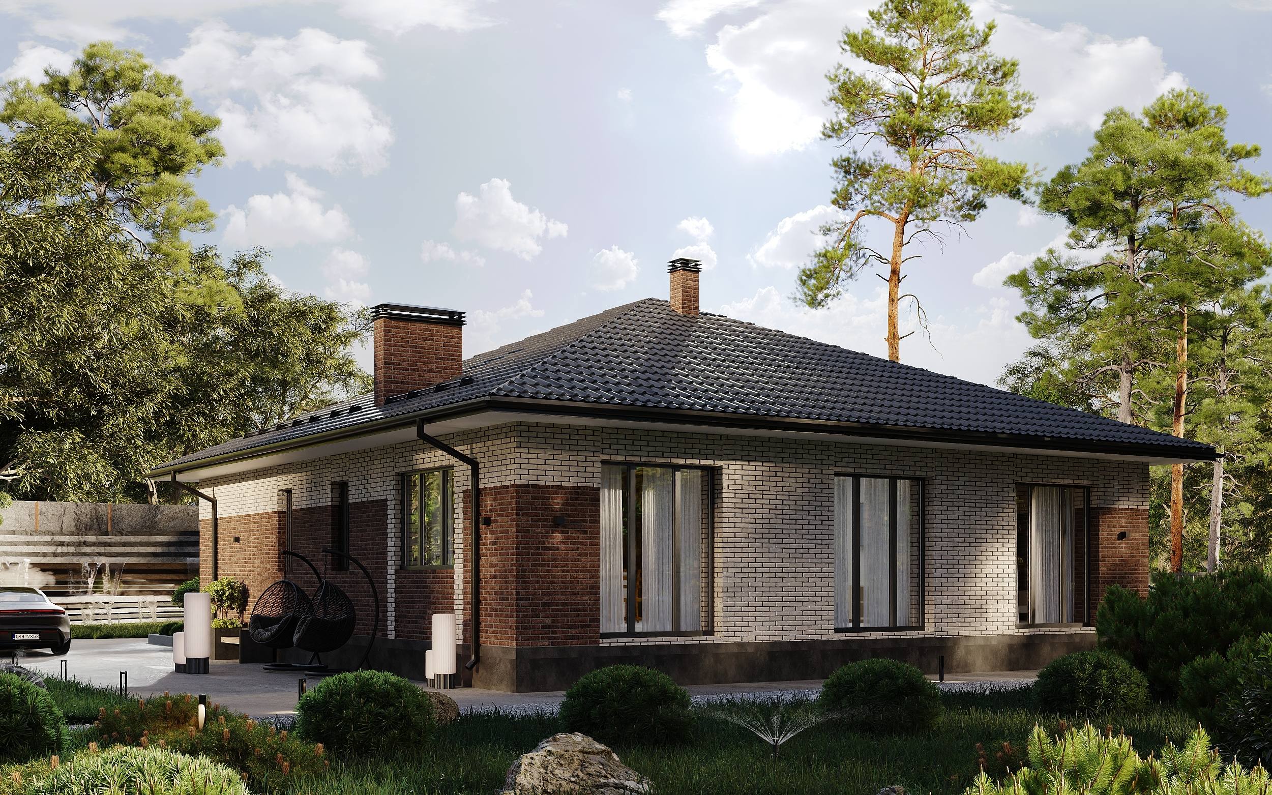 Дом сформирован углом, тем самым образуя приватное пространство внутри строения. Скат кровли увеличен для более комфортного перемещения по террасе. Со стороны основной террасы с зоной барбекю, опорами служат металлические колонны, такой прием дает ощущение невесомой, парящей конструкции.
